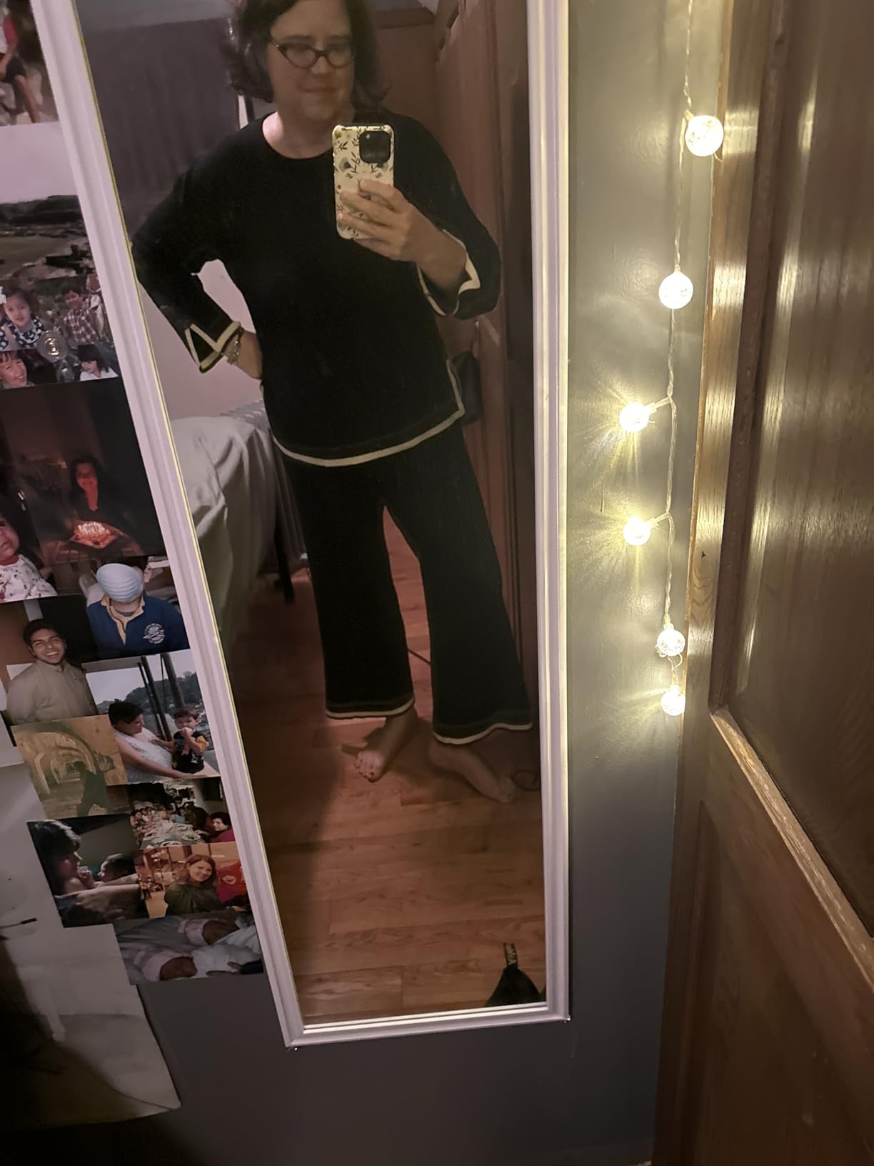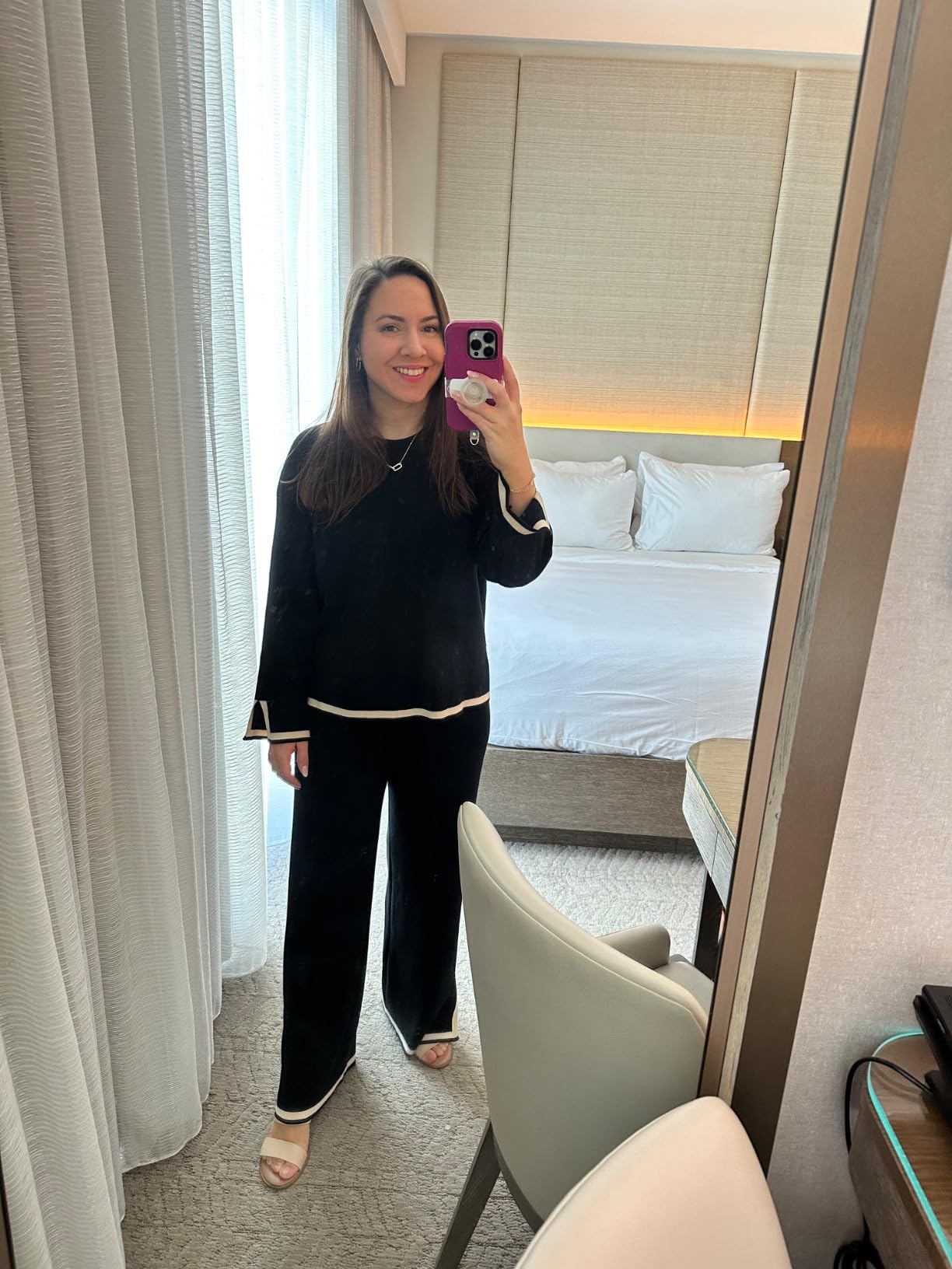 I originally purchased a medium, but sized down to an S and it fit just right while still being loose, comfortable, and not too long (Iβm 5β4β). I got so many compliments on this set and even had people stop me to ask where I got my outfit from! I love that you can dress it up with jewelry and nice shoes, or just wear around the house. I styled it for a travel/work day and looked polished (even though I felt like I was in pajamas). Such a versatile set!